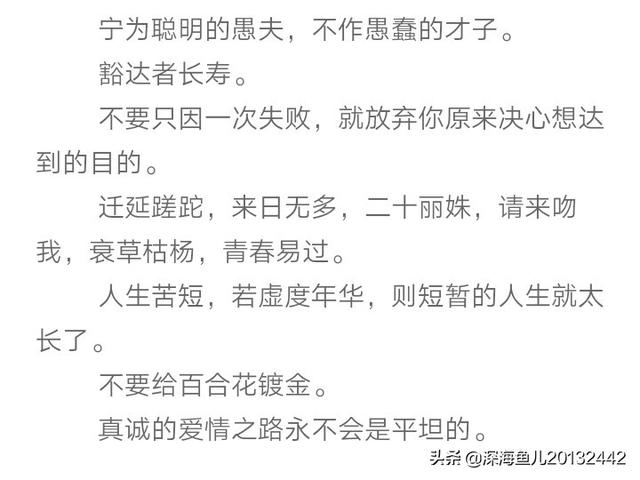 25.疑惑足以败事。一个人往往因为遇事畏缩的原故,失去了成功的机会。最好的好人,都是犯过错误的过来人;一个人往往因为有一点小小的缺点,更显出他的可爱。